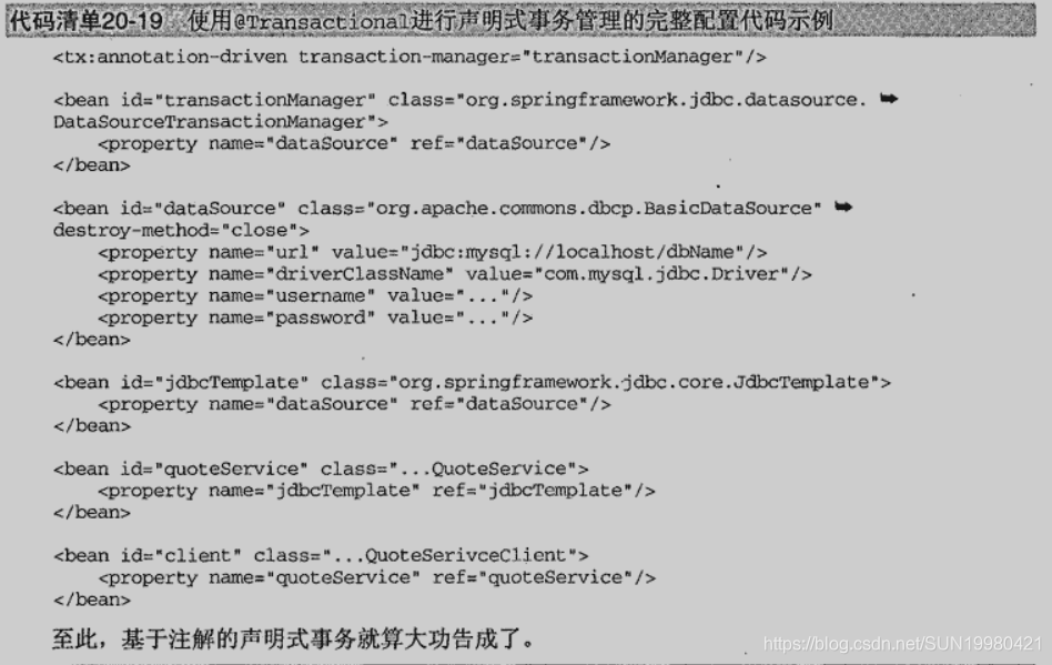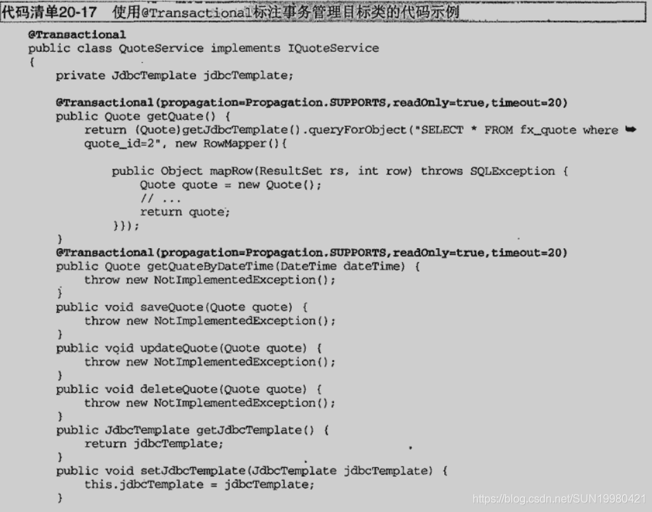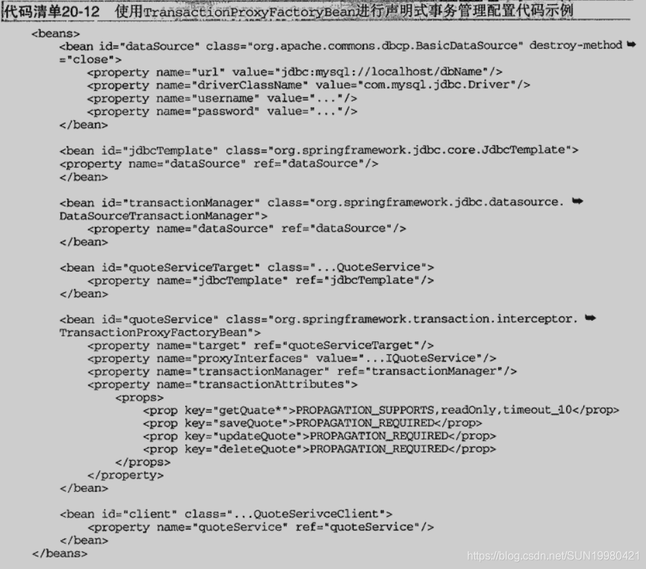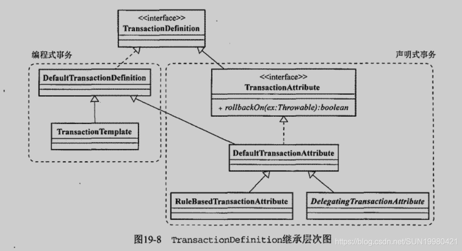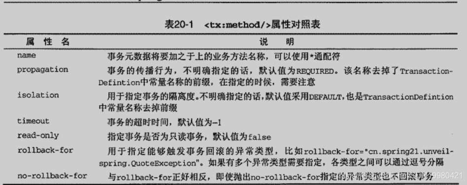 //直接使用PlatformTransactionManager进行编程事务管理的代码示例 DefaultTransactionDefinition definition = new DefaultTransactionDefinition(); definition.setTimeout(20); ... TransactionStatus txStatus = transactionManager.getTransaction(definition); try{ // 业务逻辑实现 } catch(ApplicationException e) { transactionManager.rollback(txStatus); throw e; } catch(RuntimeException e) { transacitonManager.rollback(txStatus); throw e; } catch(Error e) { transactionManager.rollback(txStatus); throw e; } transactionManager.commit(txStatus);只要为transactionManager提供合适的PlatformTransactionManager实现,然后结合TransactionDefinition开启事务,并结合TransactionStatus来回滚或者提交事务,就可以完成针对当前对象的整个事务管理。
