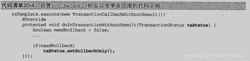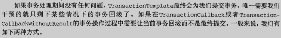 - 使用Callback接口公开的TransactionStatus将事务标记为rollBackOnly。TransactionTemplate在最终提交事务的时候,如果坚持到rollBackOnly标志状态被设置,将把提交事务改回回滚事务。