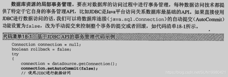 在Java的局部事务中,系统里事务管理的具体处理方式,会随着使用的数据访问技术的不同而各异。我们不是使用专用的事务API来管理事务,而是通过当前使用的数据访问技术所提供的基于connection的API来管理事务。