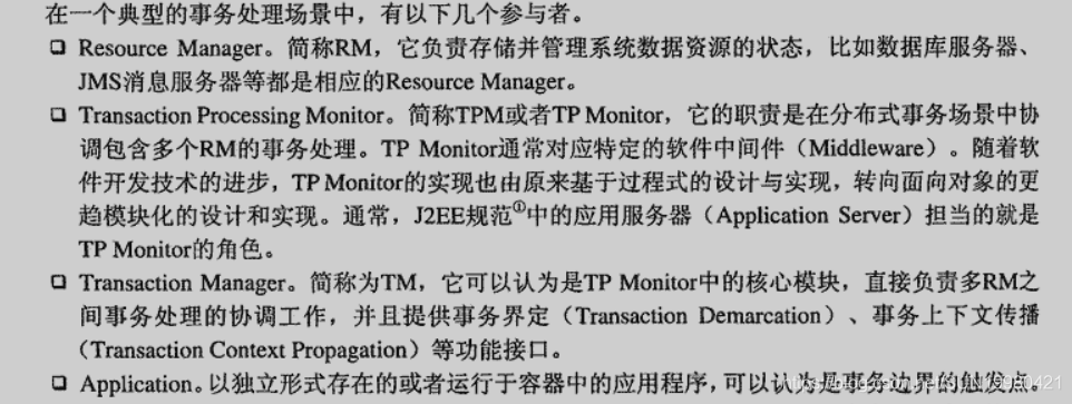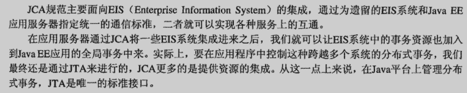 Java平台上的分布式事务,主要是通过JTA(Java Transaction API)或者JCA(Java Connector Architecture)提供支持的。