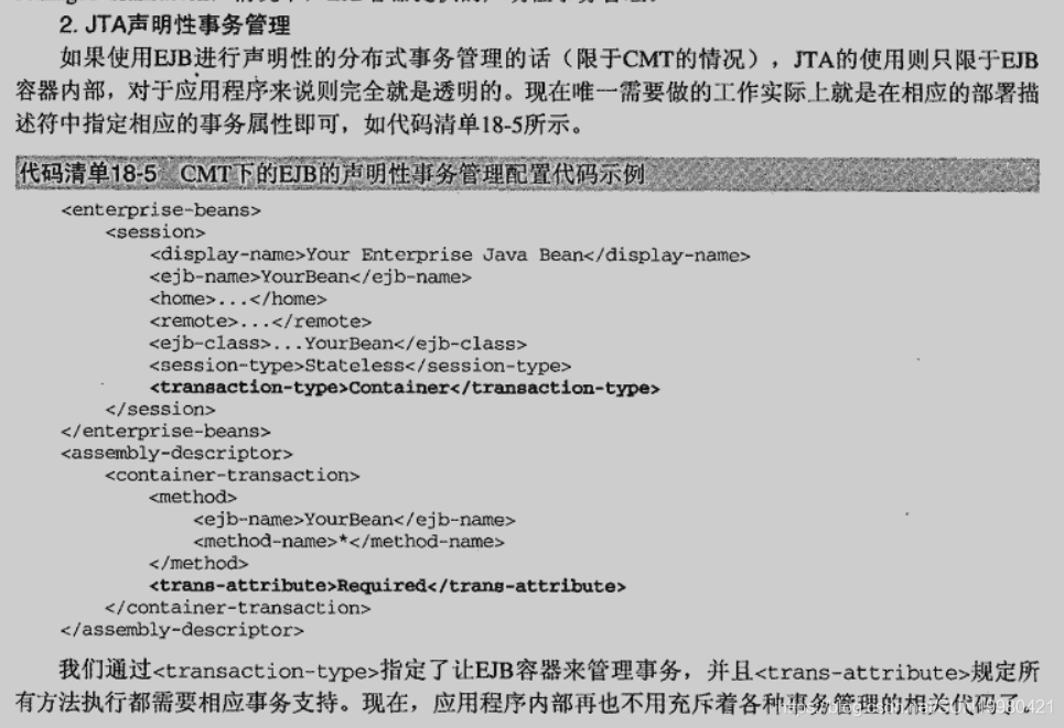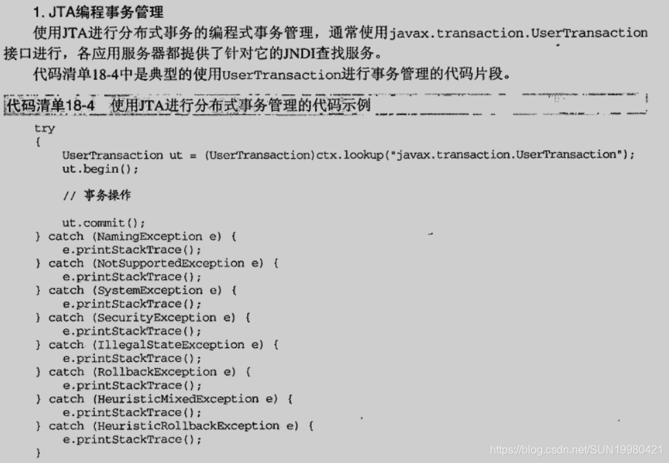 使用JTA进行分布式事务管理通常有两种方式,直接使用JTA接口的编程事务管理以及基于应用服务器的声明性事务管理。