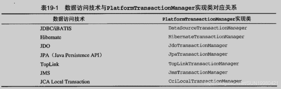 面向局部事务的PlatformTransactionManager实现类。Spring为各种数据访问技术提供了现成的PlatformTransactionManager实现支持。