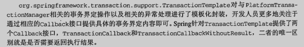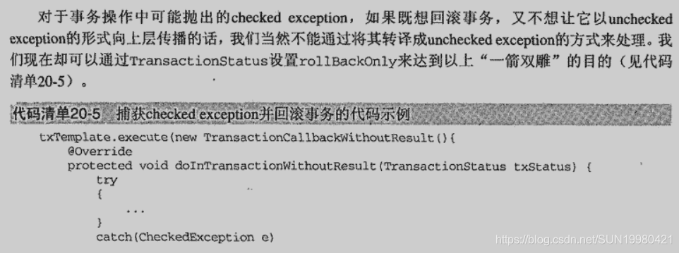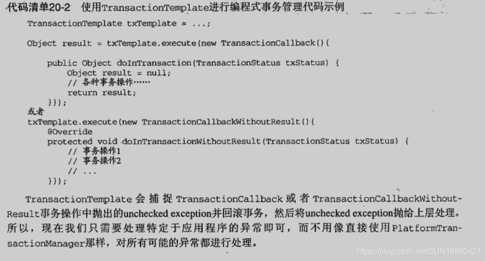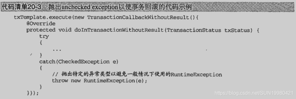 - 抛出unchecked exception,TransactionTemplate会为我们处理事务的回滚。如果事务中可能抛出checked exception,那么就得在Callback内部捕获,然后转译为unchecked exception后抛出。
