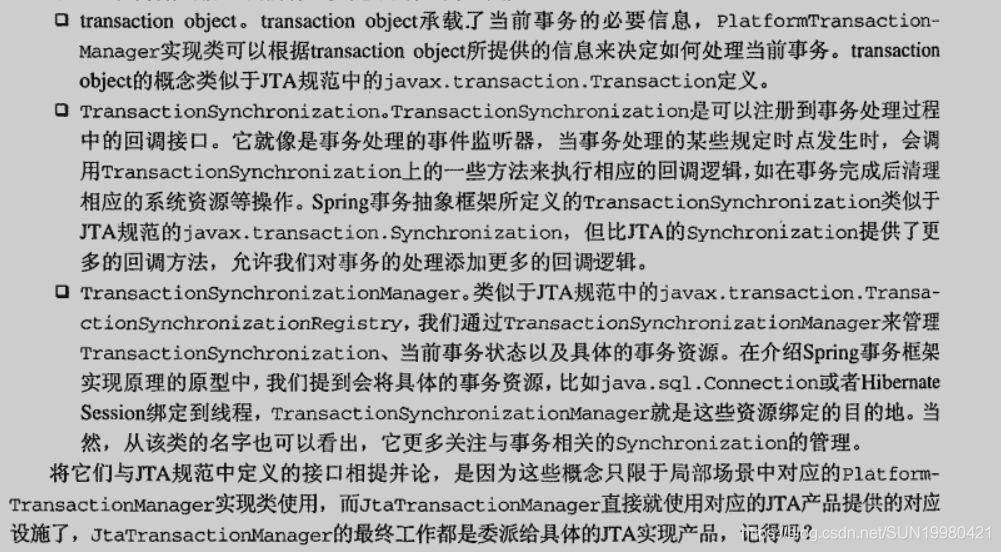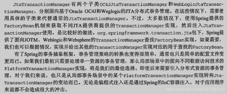 面向全局事务的PlatformTransactionManager实现类。org.springframework.transaction.jta.JtaTransactionManager是Spring提供的分布式事务的PlatformTransactionManager实现。