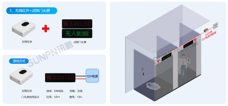 3、无线红外+点阵门头屏:无线红外用 5 号电池供电,点阵门头屏接 12V+、12V-,实现无线通讯。