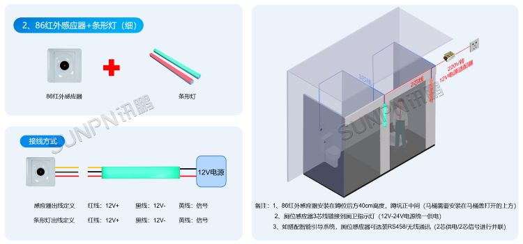 2、86 红外感应器+条形灯:感应器安装在蹲位后方 40cm 高度(马桶需装在马桶盖上方),3 芯线连接,12V-24V 电源统一供电。