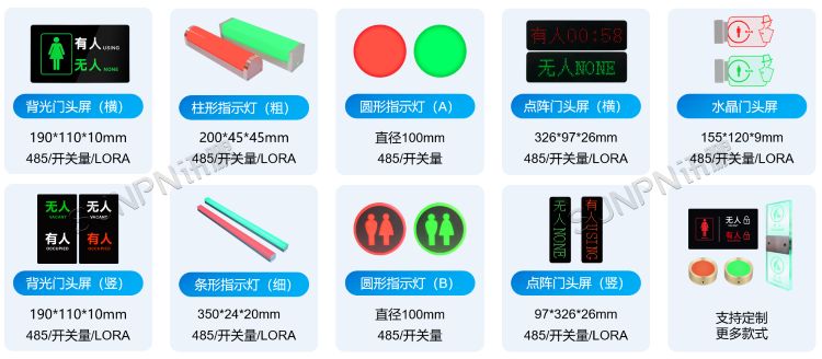 涵盖背光门头屏、柱形指示灯、圆形指示灯、点阵门头屏、水晶门头屏、条形指示灯,支持定制化款式,适配不同公厕装修风格。