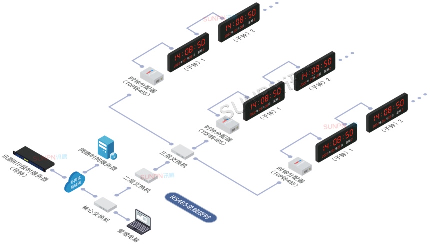 ①对于RS485型时钟,设备间需通过网线串联,并统一接入时钟分配器(即TCP转485转换器);