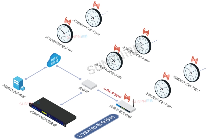 ①单个学校、医院等场景需配置1台母钟无线信号发射器(需提前接入网络或获取NTP服务器标准时间);