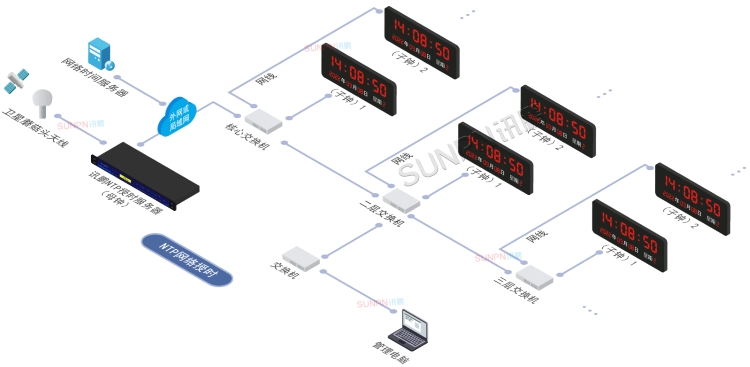 2. NTP网络授时系统架构:① 若现场具备外网接入条件,子钟可直接从外网网络时间服务器获取标准时间并完成同步;② 若仅为局域网环境,则需部署1台母钟NTP服务器,由其接收卫星标准时间,其余子钟通过局域网访问母钟获取同步时间。同时配套时钟管理软件,可通过电脑实现对全系统时钟的集中管理。
