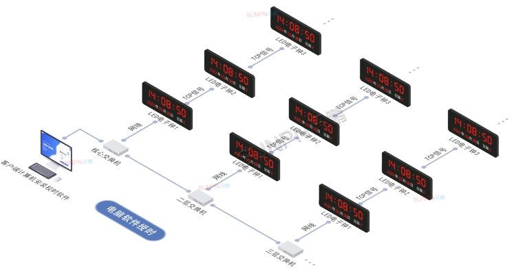 1. 电脑软件授时系统架构:需配置1台电脑工作站并安装时钟管理软件,其余子钟通过局域网接入该电脑工作站,获取软件同步的时间。该管理软件支持对所有时钟进行在线参数配置与集中管理。