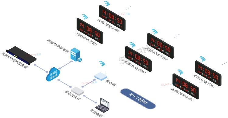 ② 若仅为局域网环境,则需部署1台母钟NTP服务器,由其接收卫星标准时间,其余子钟通过WiFi接入局域网访问母钟获取同步时间。同时配套时钟管理软件,可通过电脑实现对全系统时钟的集中管理。