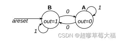 这是一个摩尔状态机,具有两个状态,一个输入和一个输出。实现此状态机。请注意,重置状态为 B。