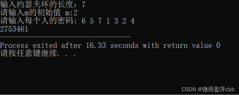 约瑟夫环问题的具体描述是:设有编号为1,2,……,n的n(n>0)个人围成一个圈,从第1个人开始报数,报到m时停止报数,报m的人出圈,再从他的下一个人起重新报数,报到m时停止报数,报m的出圈,……,如此下去,直到所有人全部出圈为止。