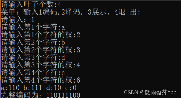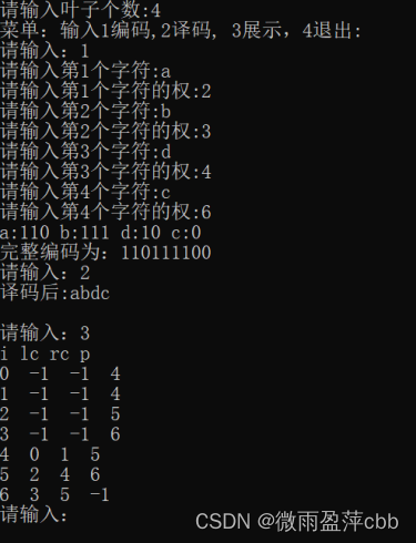 printf("菜单:输入1编码,2译码, 3展示,4退出:\n");
