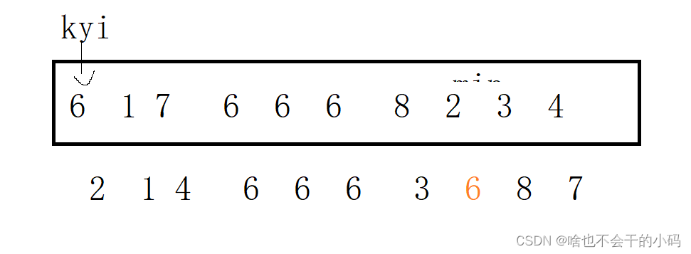 ✨在数组里面选小的数,选到小的就更新一下,相同的不更新,然后继续找,直到遍历结束,把最小的放到左边🤔看着好像是稳定的,真是一回事,但是我们只是注意了小的耶🐸,忘记了我们在,在第一个位置的数的情况,如下:我的5和原来的5相对顺序是不是就已经发生改变了🤔记住这个例子它是不稳定的