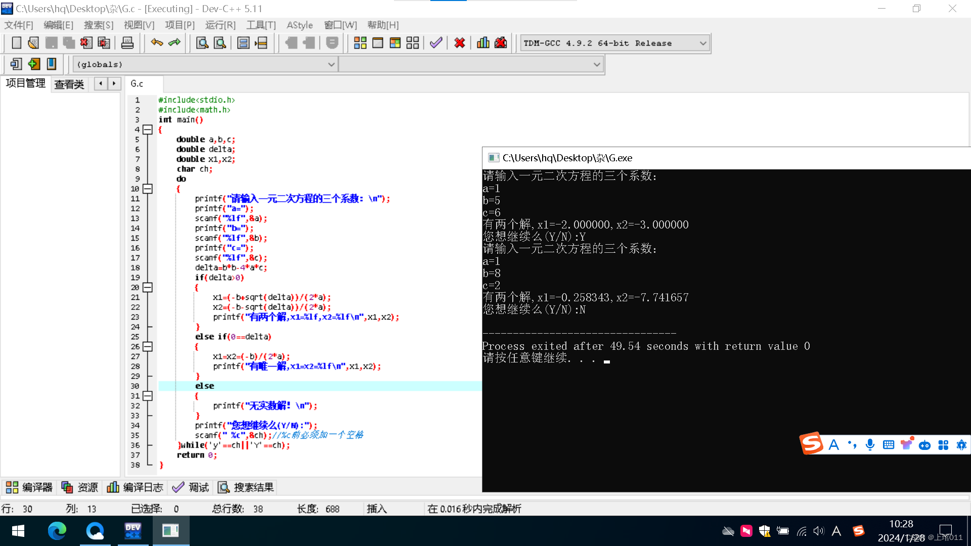 printf("有两个解,x1=%lf,x2=%lf\n",x1,x2);
