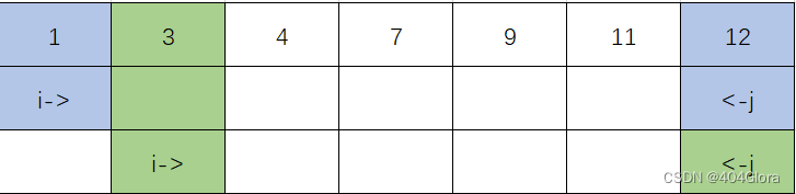 以nums=[ 1,3,4,7,9,11,12 ] , target=15为例,得如下所示的模拟图。