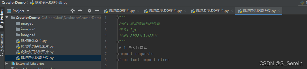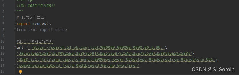 1.新建一个Python文件。 2.导入所需要的库 3.定义一个爬取目标的网址 4.定义headers 5.模拟发送请求,获取网页相关内容 6、利用etree梳理爬取的网页 7、利用xpath全程搜索class属性为j_joblist 的<div> 分析网页