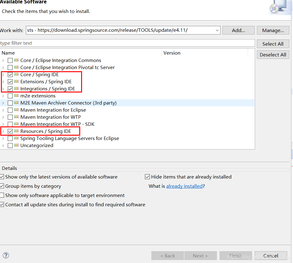 3、借东风——在Eclipse上安装Spring IDE插件,Help → Install New SoftWare → Add → 输入对应站点 (https://download.springsource.com/release/TOOLS/update/e4.11/)→ 点击Add → 选中4个带IDE的Jar包后,按部就班的点击NEXT安装就OK了