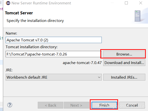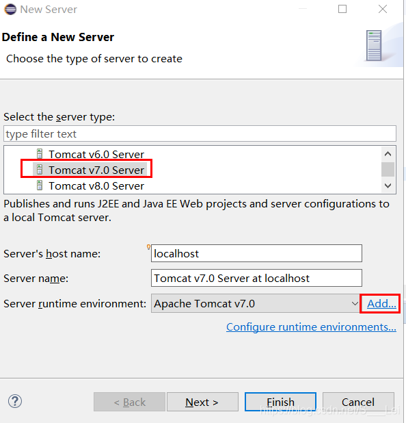 但是会发现又出现没有服务器的问题,这个问题很好解决,点击提示信息便可添加 Tomcat 服务器,我本地有实现下载好的Tomcat 7,所以就选择Tomcat v7.0 Server,然后点击Add添加事先下好的Tomcat 7服务器,选择完毕后,点击Finish服务器便添加成功