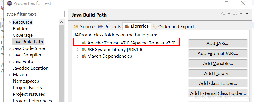 解决方案:选中项目,点击右键 → Built Path → Configure Build Path → Add Libraries → Server Runtime → Next→ 选中Apache Tomcat v7.0 → Finish → Apply,问题解决
