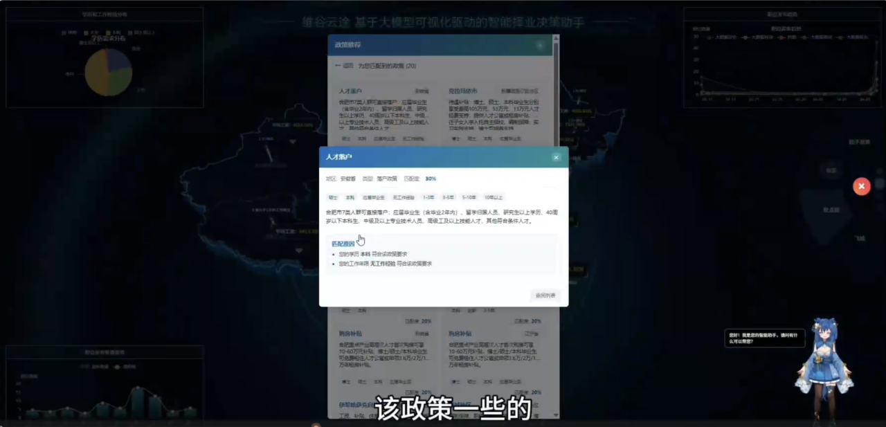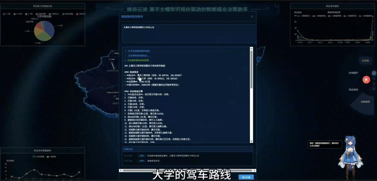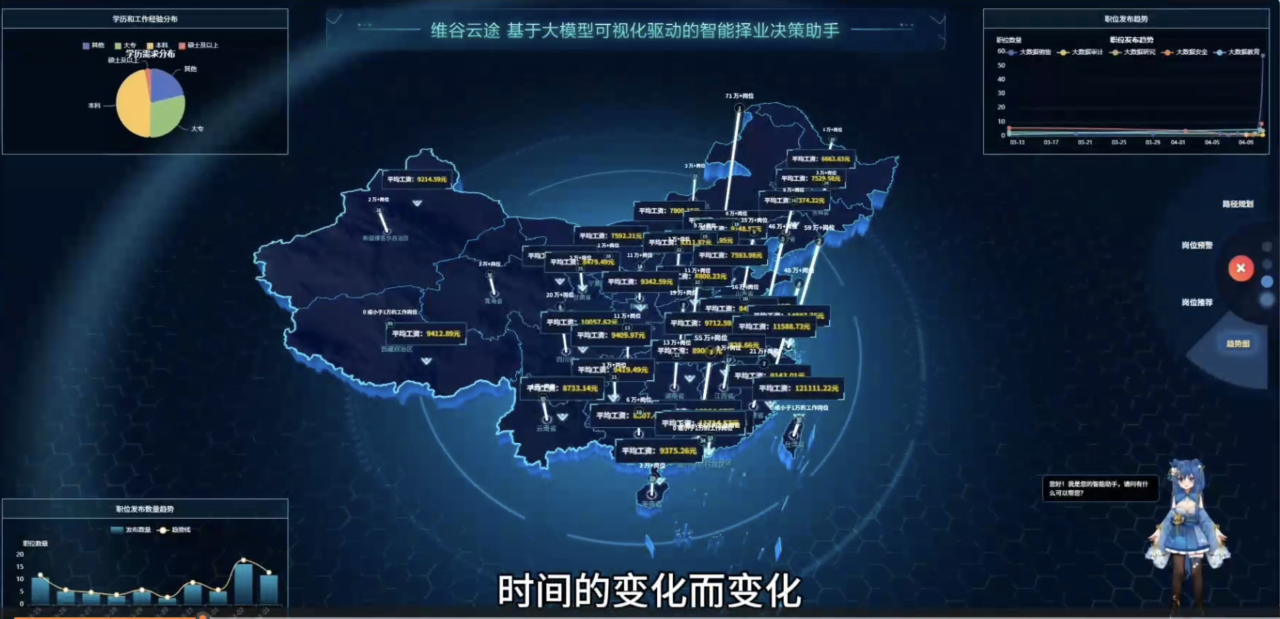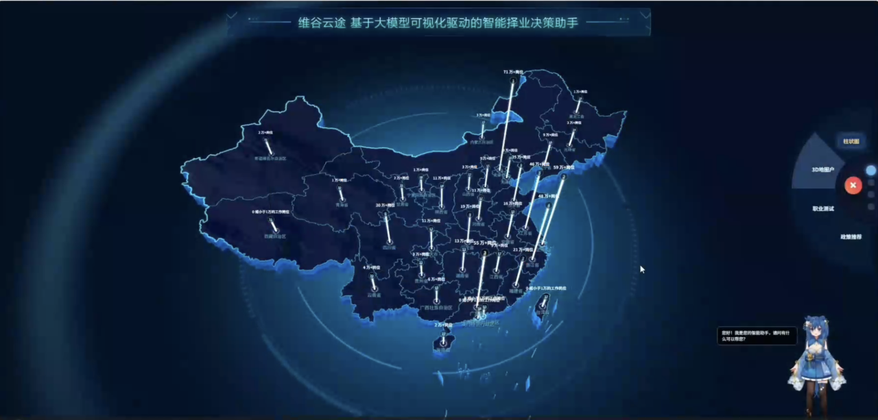 “维谷云途”构建了以“数据驱动+技术赋能+用户中心”为核心理念的招聘信息展示与咨询平台。系统整体借助3D地图直观呈现全国招聘信息分布,同时配备专业智能助手实现精准问答服务。用户只需通过简单的语言指令,即可快速了解各地区招聘态势及相关政策,从而辅助决策与个性化咨询。平台通过融合大模型的深度分析能力与数据可视化的直观呈现,打造了人工智能与大数据深度融合的新范式,从而为求职者提供高效、智能的产品体验。