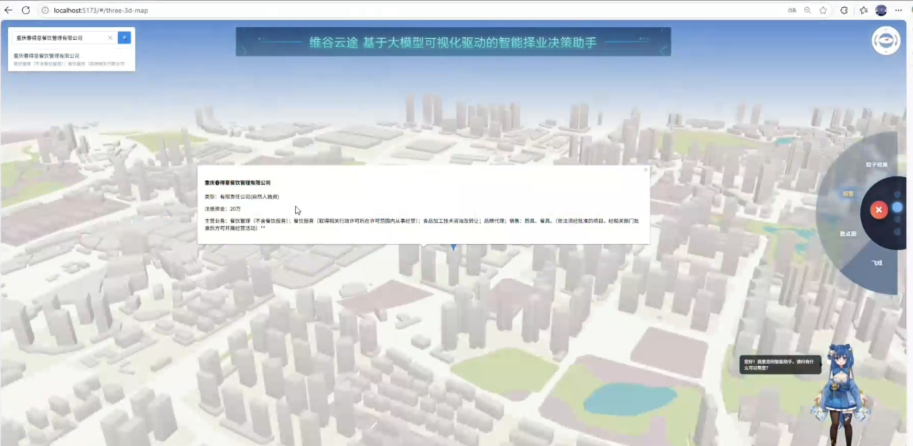 本系统成功实现了3D地图可视化与智能体问答系统的深度融合,构建直观、沉浸式的用户体验: