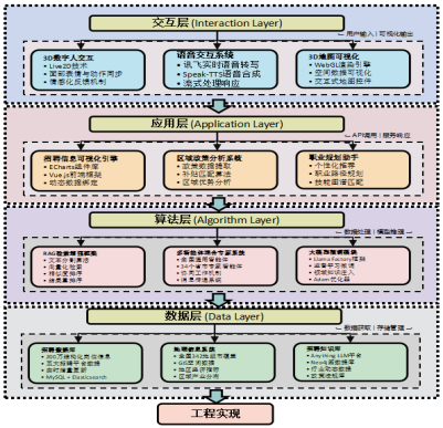 本研究在招聘信息智能分析与交互领域实现了多项关键技术创新,主要体现在混合大模型协同推理机制、多智能体协同工作模型、3D地图与智能体实时交互联动机制以及多模态交互融合技术四个方面。