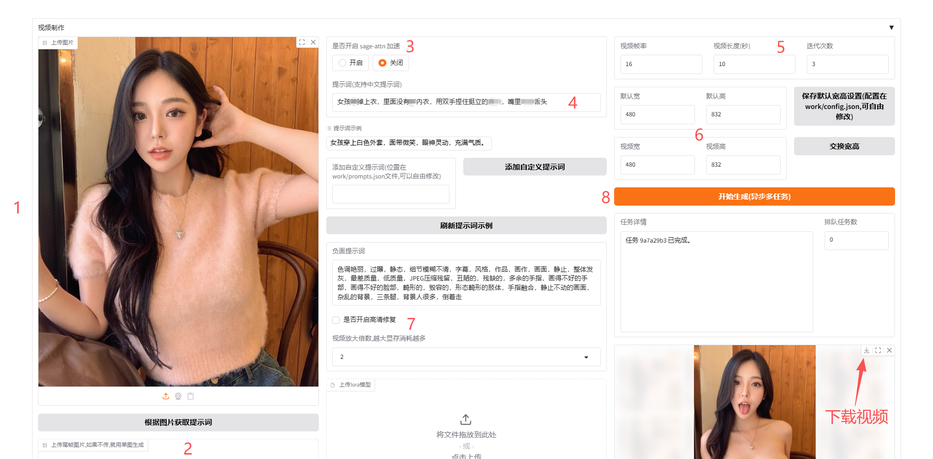 6.选择生成视频的宽高,默认480:832,数值可调,低显卡可以选择320:480,横版视频比例832:480