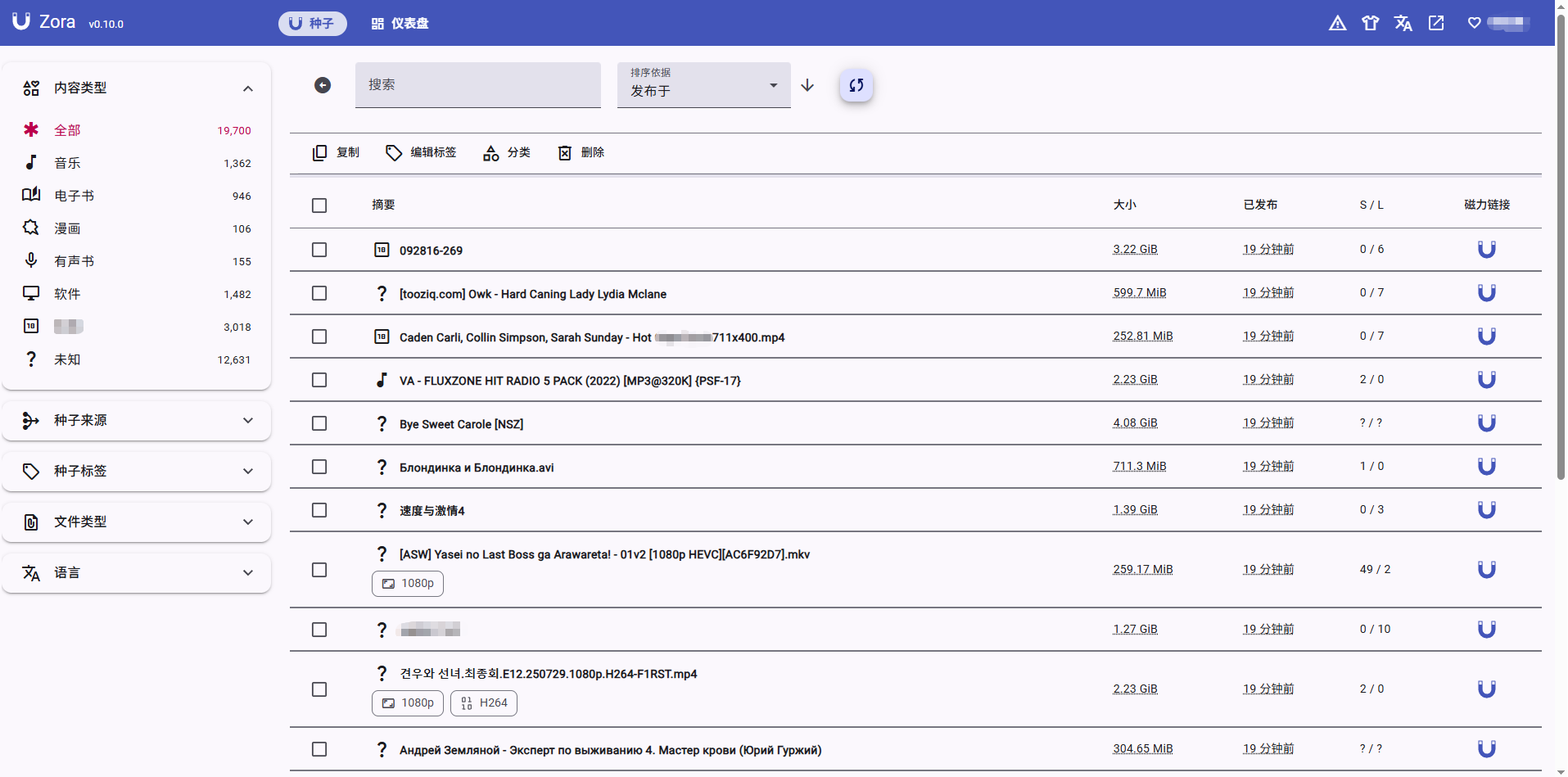 Zora自带文件管理系统,用于存放种子数据,在这里可以查看资源的大小以及发布时间,同时还提供了索引和分类功能,方便站长编辑和删除种子文件