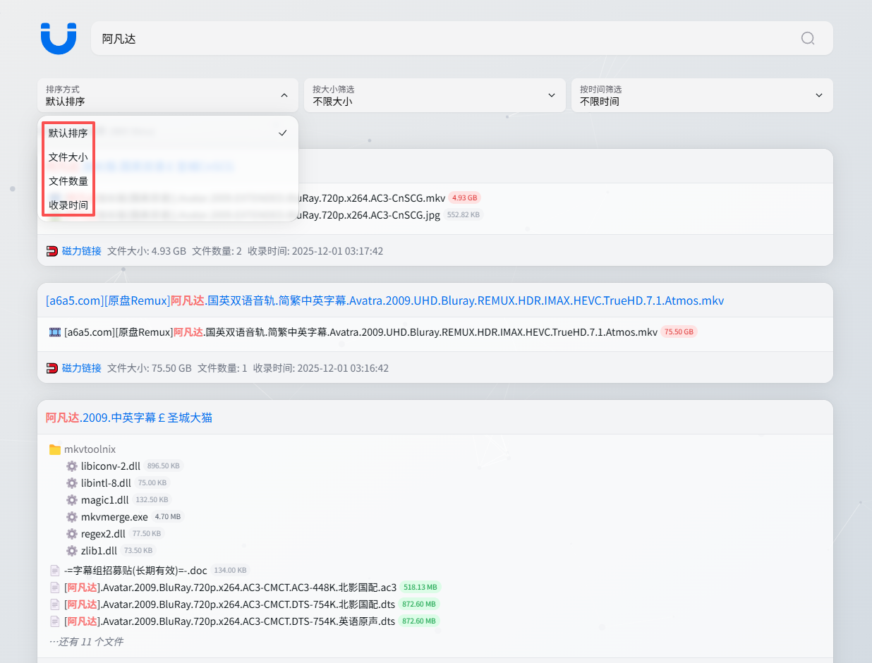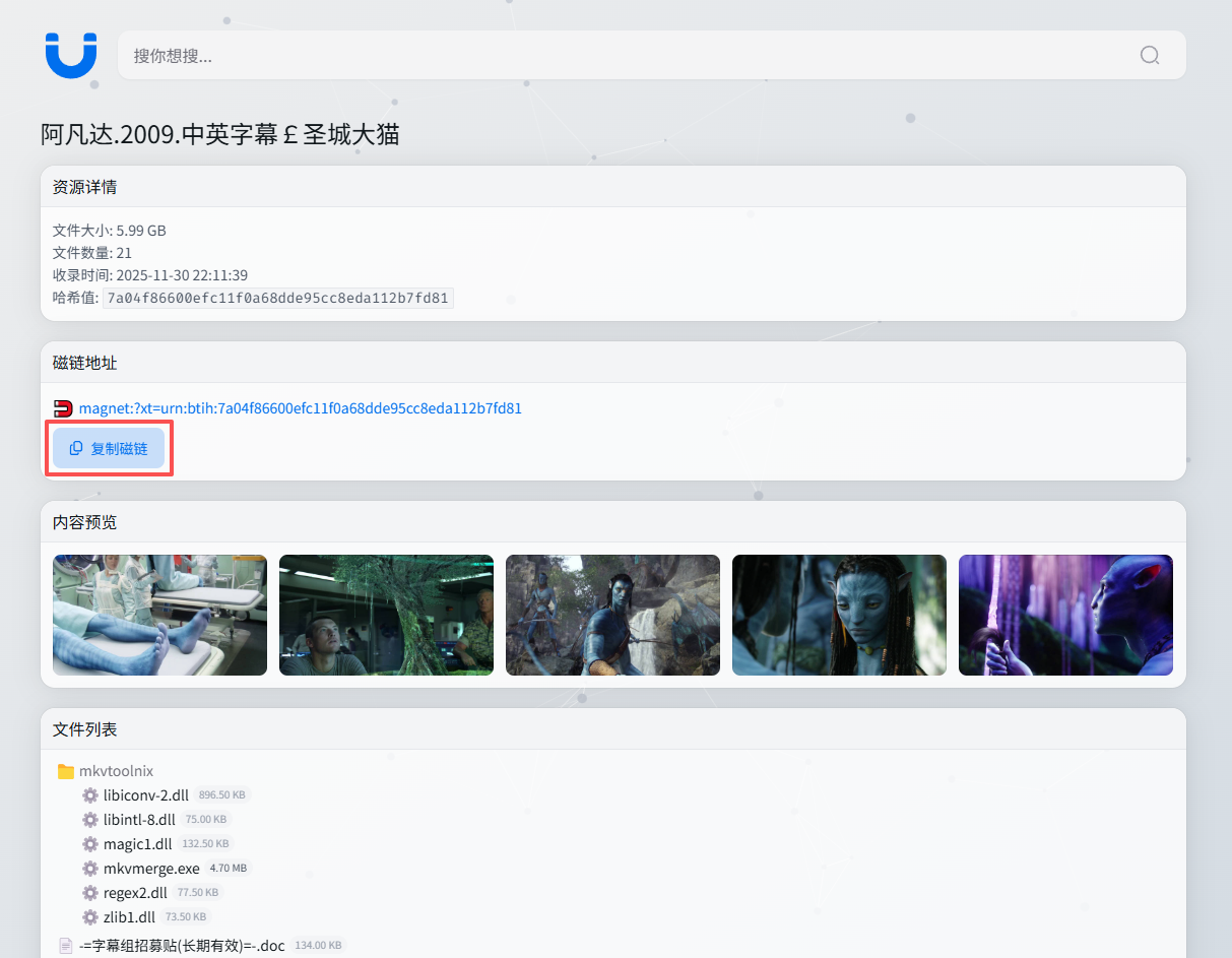 搜索到的结果支持大小与时间排序,同时也能看到收录时间,点击资源详情,用户可以了解到更多关于该资源的信息,如磁力链接、文件列表以及内容预览窗等,磁力链接支持一键复制粘贴,非常方便