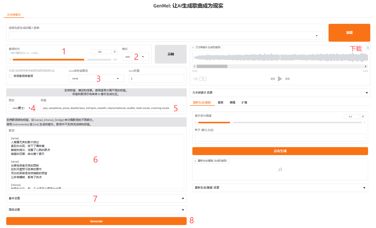 GenMel不仅能生成完整的旋律、歌词、人声与伴奏,还能通过LoRA和ControlNet在内的多种微调技术适配不同创作场景,例如声线克隆、风格迁移、局部段落重绘、多语言演唱适配等,甚至能一键输出和弦循环或鼓组节奏,可直接嵌入现有创作流程,降低AI音乐应用的开发门槛。此外,GenMel还支持实时编辑和重生成歌曲,让音乐爱好者能够快速调整和完善作品,大大提升了创作效率