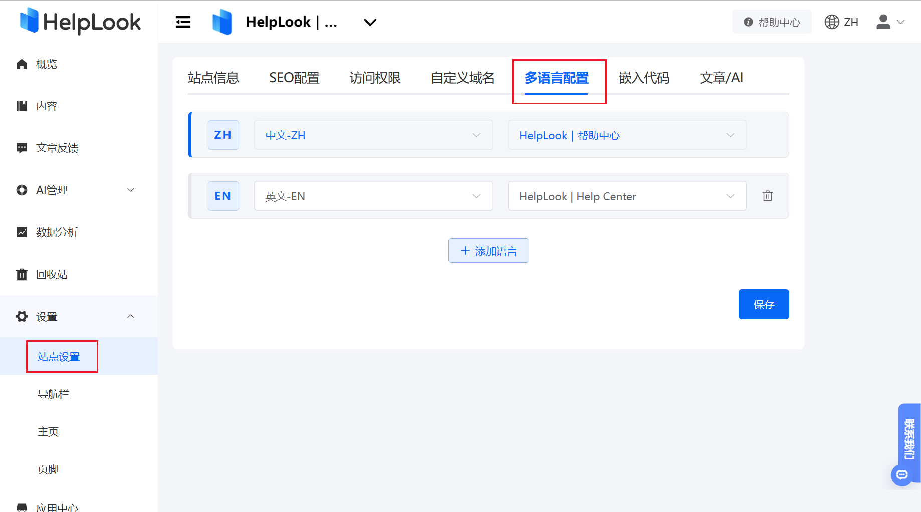 创建不同语言站点,并在不同站点发布内容。HelpLook目前已支持6种站点语言选择!