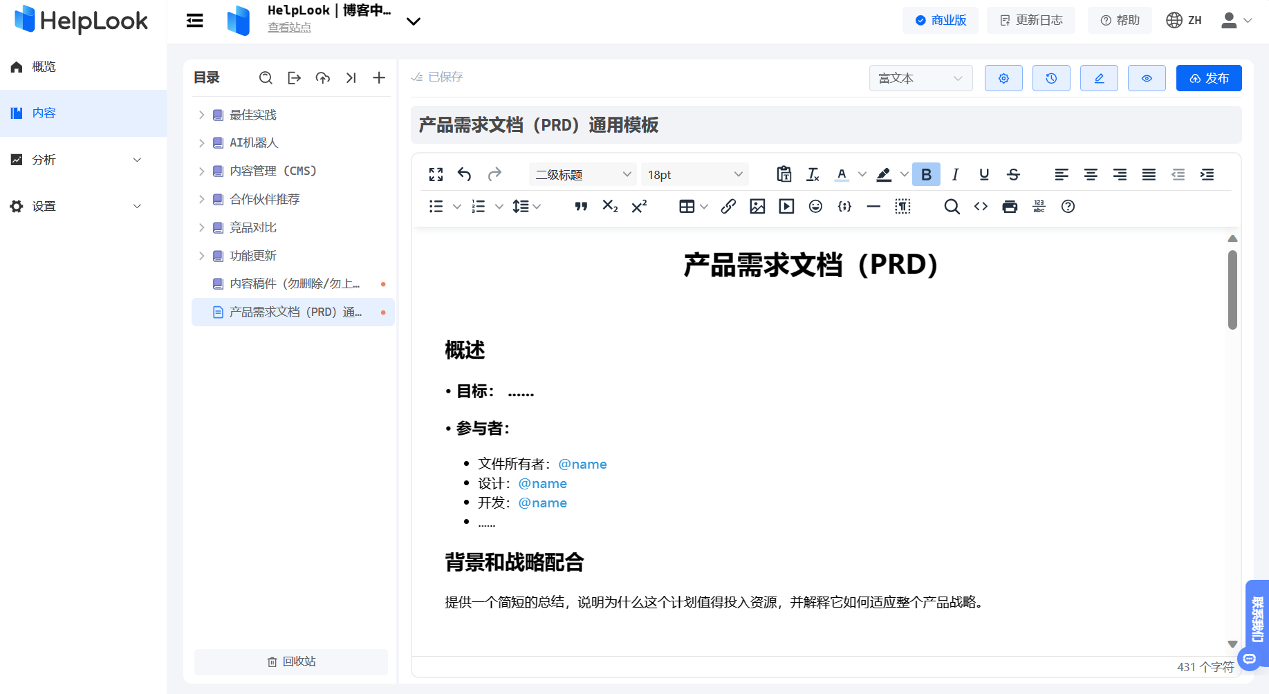 团队协作编写:HelpLook允许多个团队成员协作编写PRD,您可以邀请相关人员参与文档的创建和编辑。