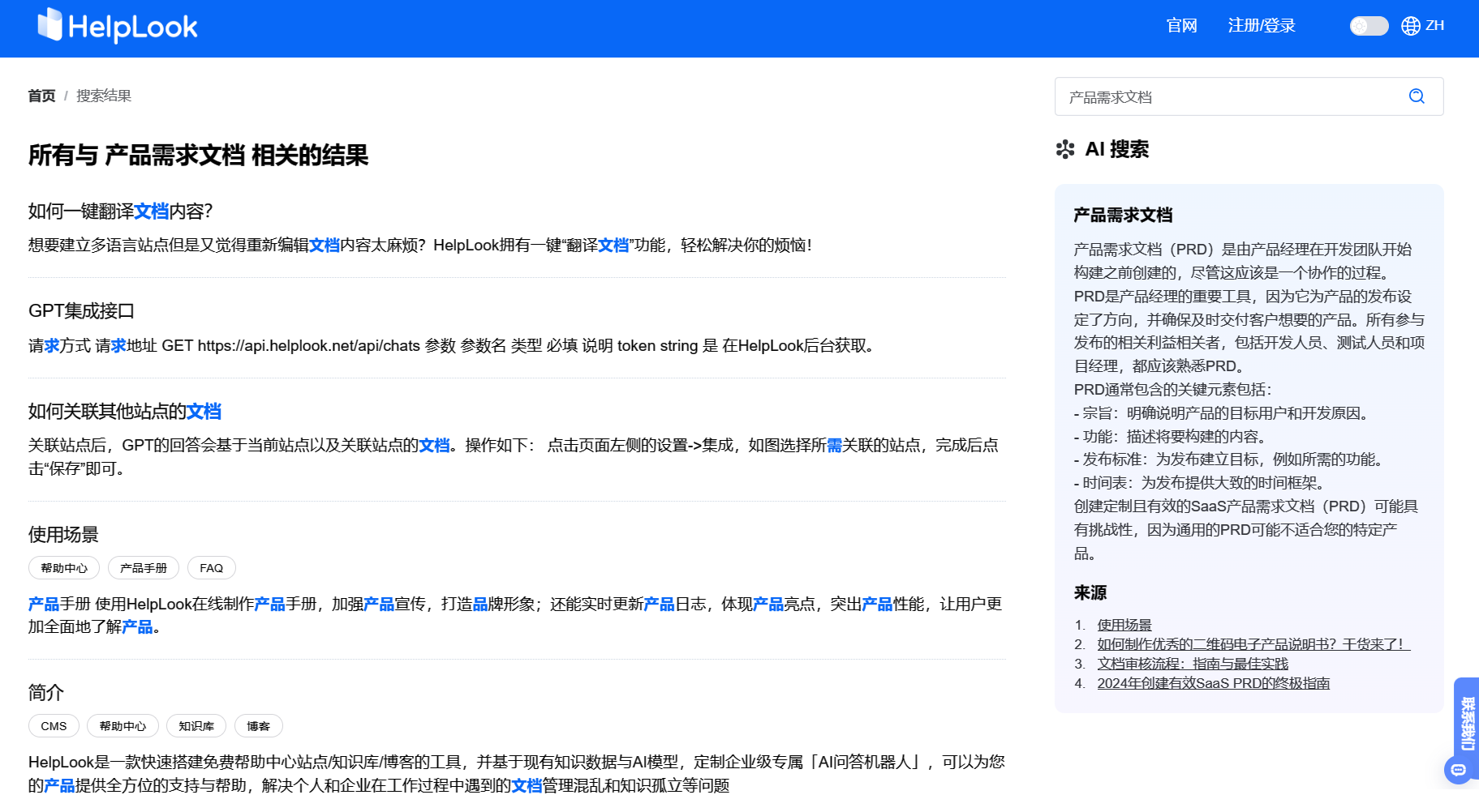 内容检索:HelpLook具有强大的AI搜索功能,可以帮助团队成员快速找到他们需要的信息。这对于在比较长的PRD中查找特定需求、功能或关键字非常有用,能够有效提高团队的工作效率。
