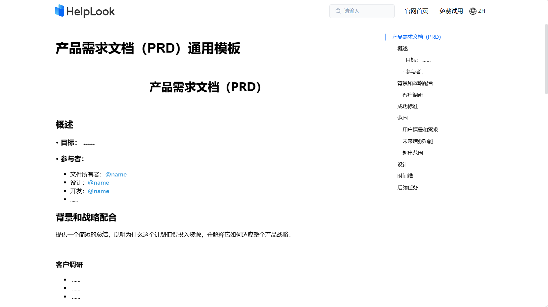 | 以上是PRD的一个示例,HelpLook是一个知识管理和帮助中心软件,它提供了一系列功能,可以为编写PRD提供帮助。