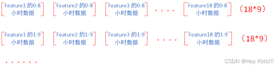上一篇文章提到的代码段的目的是将分散在每天的各个feature的数据重新整合归类,这一篇的代码段的目的是把每一个时间段的数据进行汇总,第一行只要0-8小时的所有数据,第二行只要1-9小时的所有数据以此类推,这样处理就能把数据完美划分了,不得不说李宏毅老师还是厉害的。