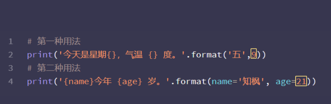 # 第一种用法print('今天是星期{},气温 {} 度。'.format('五', 9))# 第二种用法print('{name}今年 {age} 岁。'.format(name='知枫', age=21))