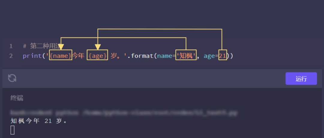 第二种用法:花括号{}中填入字符,如{name},name 就像替换字段的标识,format() 按照标识,用值替换对应的替换字段。