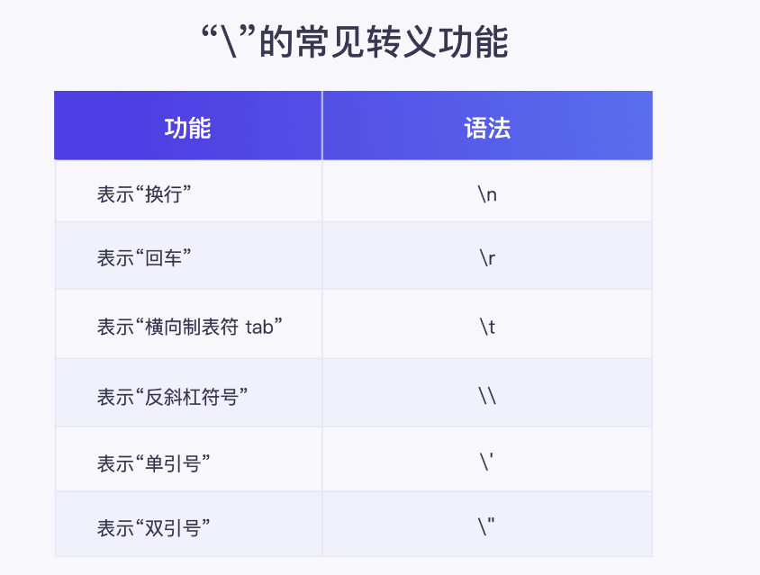 常用的转义字符有:\n 换行,\r 回车,\\ 反斜杠符号,\' 单引号,\" 双引号,\t 横向制表符 tab。