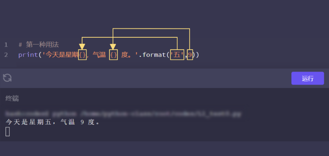 第一种用法:'今天是星期{},气温 {} 度。'.format('五', 9)
