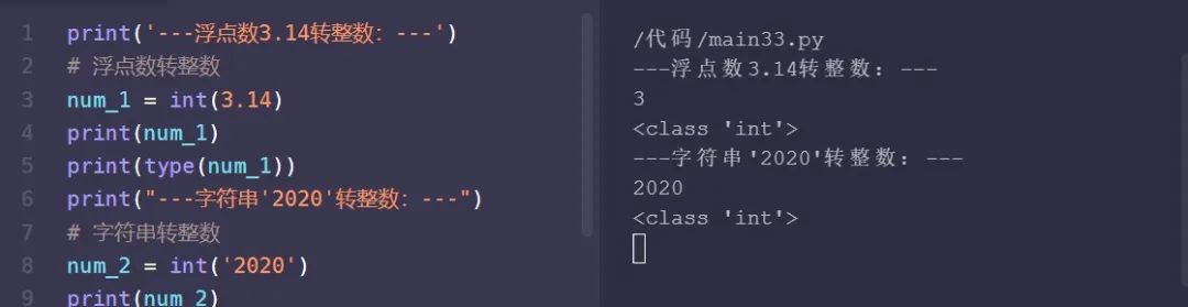print('---浮点数3.14转整数:---')# 浮点数转整数num_1 = int(3.14)print(num_1)print(type(num_1))print("---字符串'2020'转整数:---")# 字符串转整数num_2 = int('2020')print(num_2)print(type(num_2))
