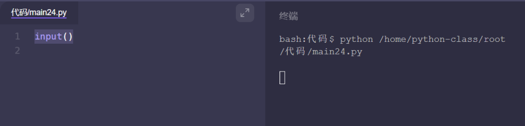 程序运行到 input() 函数时,终端会出现光标提示用户输入内容,此时需要在终端输入内容,再按回车结束输入。