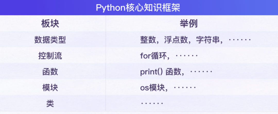 Python 的核心知识框架包括数据类型、控制流、函数、模块和类五个板块。