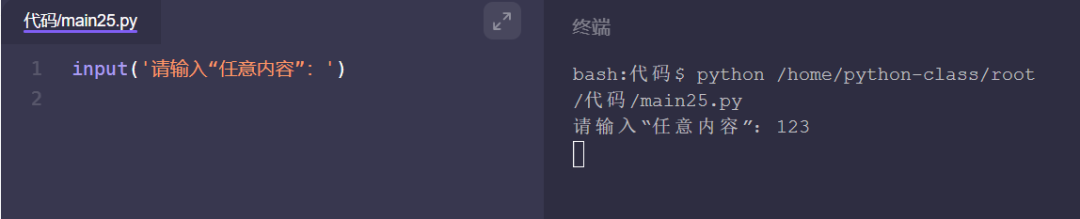 也就是说,使用 input() 函数时,无论你在终端输入的内容是什么,被 input() 函数获取后,最终得到的结果都是字符串类型。