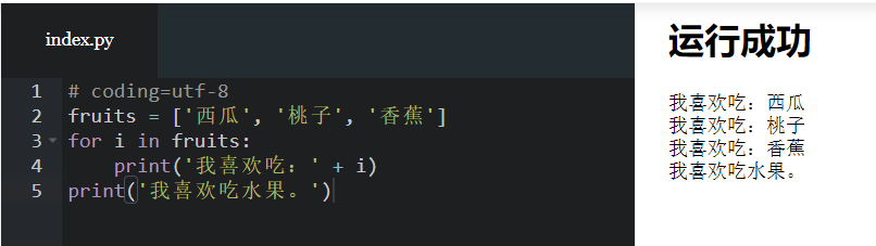 fruits = ['西瓜', '桃子', '香蕉']for i in fruits:print('我喜欢吃:' + i)print('我喜欢吃水果。')