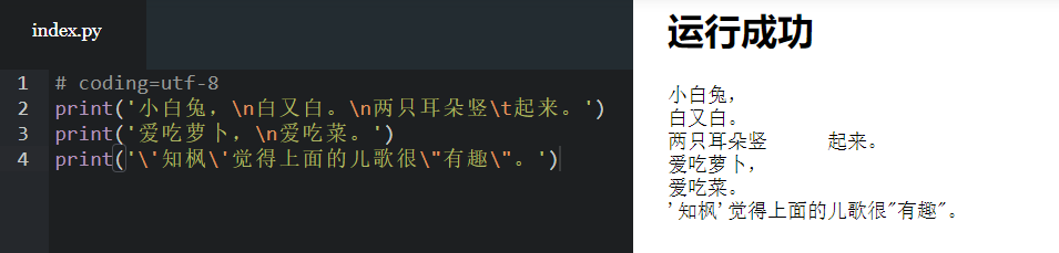 print('小白兔,\n白又白。\n两只耳朵竖\t起来。')print('爱吃萝卜,\n爱吃菜。')print('\'知枫\'觉得上面的儿歌很\"有趣\"。')