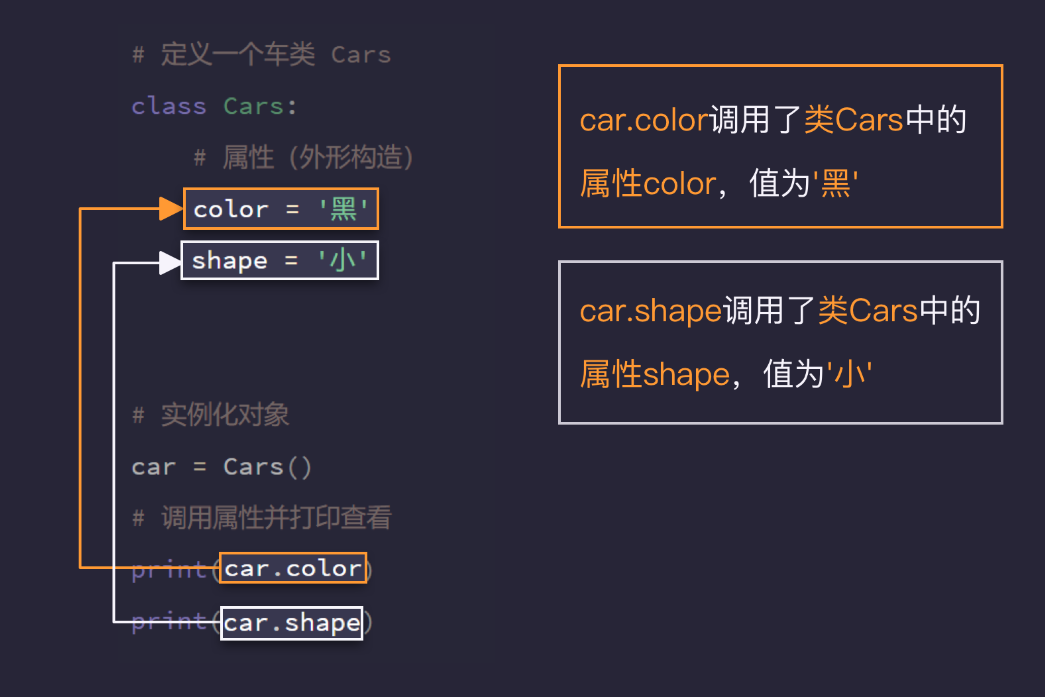 # 定义一个车类 Carsclass Cars:# 属性(外形构造)color = '黑'shape = '小'# 实例化对象car = Cars()# 调用属性并打印查看print(car.color)print(car.shape)