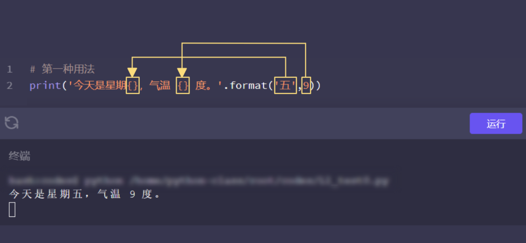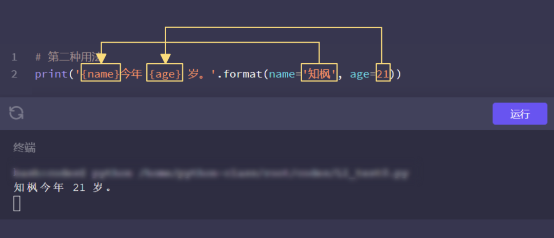 回到这一题,用了按照位置顺序进行替换的方法,所以 format() 的参数'知枫'会被传入到第一个也是唯一一个 {} 中替换。这就是 format() 的用法。
